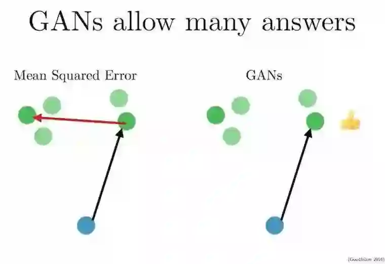 以下面这个任务为例,将蓝色输入圆点映射到绿色输出圆点上(绿色圆点是蓝色圆点可能输出的结果)。红色的箭头代表预测错误,意味着蓝色圆点在一段时间后会映射到绿色圆点的均值上——这正是导致我们试图预测的图像变得模糊的原因。