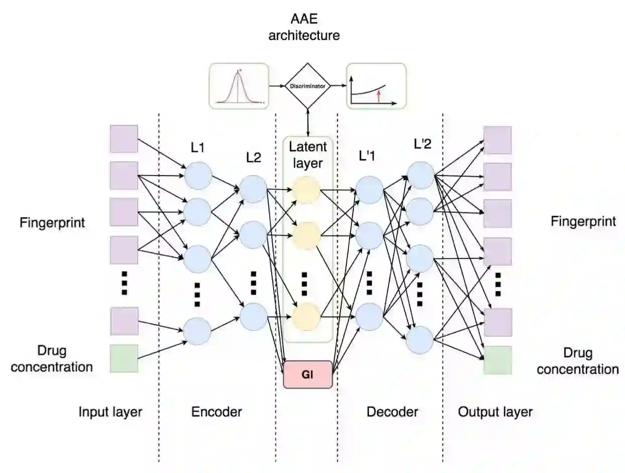 该公司将成长抑制(Growth Inhibition)百分率数据(从 GI 可以看出药物治疗后癌细胞数的减少量)、药物浓度和指纹图谱作为输入,训练对抗式自动编码器。
