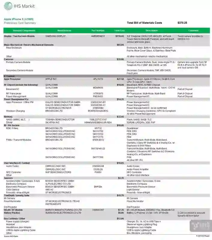 所以根据 IHS Markit 的成本表推算后我们不难发现,这款 iPhone 的物料成本会比 iPhone X 二代低100美元左右,比 iPhone 8 贵不了多少,贵在屏幕和前置 TureDepth 摄像头,便宜在 Force Touch 。作为参考, iPhone X 的毛利率高达63%。