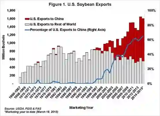 根据美国农业部的统计,美国对华大豆出口在最近几年迅速增长,成为美国农业出口的一个典范。2016年,美国对中国的大豆出口占其大豆总出口量的58%,而在2017年中国进口的美国高粱属农产品(以大豆为主)价值接近10亿美元。