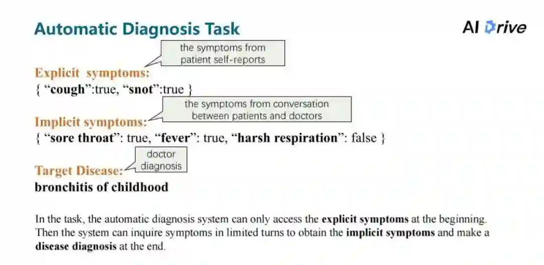 近来,自动诊断引起了研究人员越来越多的关注,因为它能够简化诊断程序、帮助做出更好的诊断决定,甚至具有帮助建立诊断对话系统的潜力。但是自动诊断系统是建立在机器和病人之间的对话上的,所以需要允许机器通过不断询问病人的症状来做出相应诊断。