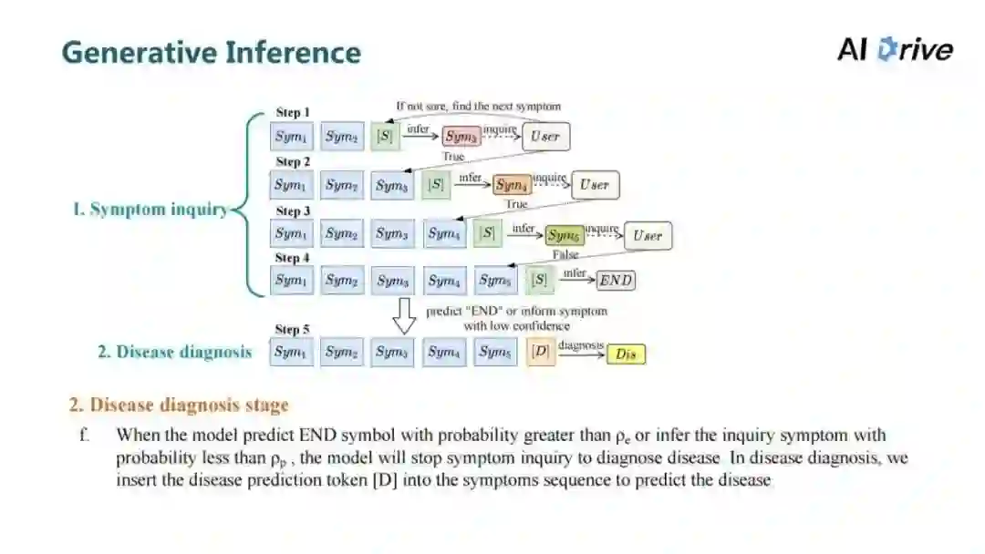 考虑到疾病诊断过程可以自然地被看作是一个序列的生成,在本工作中把自动诊断重新表述为序列生成的任务,与之前的强化学习方法不同,多步骤的查询过程被明确的建模为:生成包含症状和诊断的序列。这可以提高多步骤推理过程的效率和可解释性。