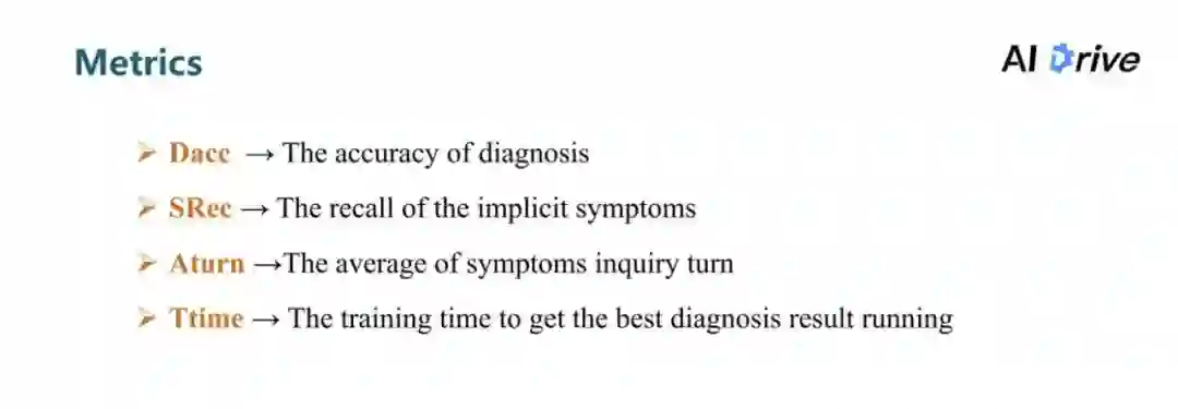 评价机制主要有四个:Dacc 是诊断的准确率;SRec 是隐性症状的召回率;Aturn 是症状询问的平均轮数;Ttime 是模型的训练时间。