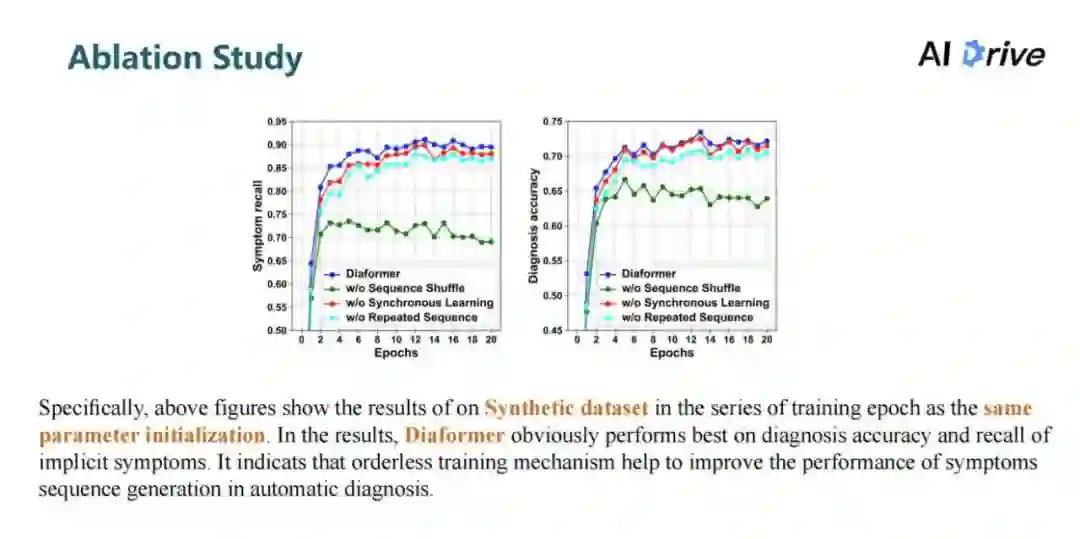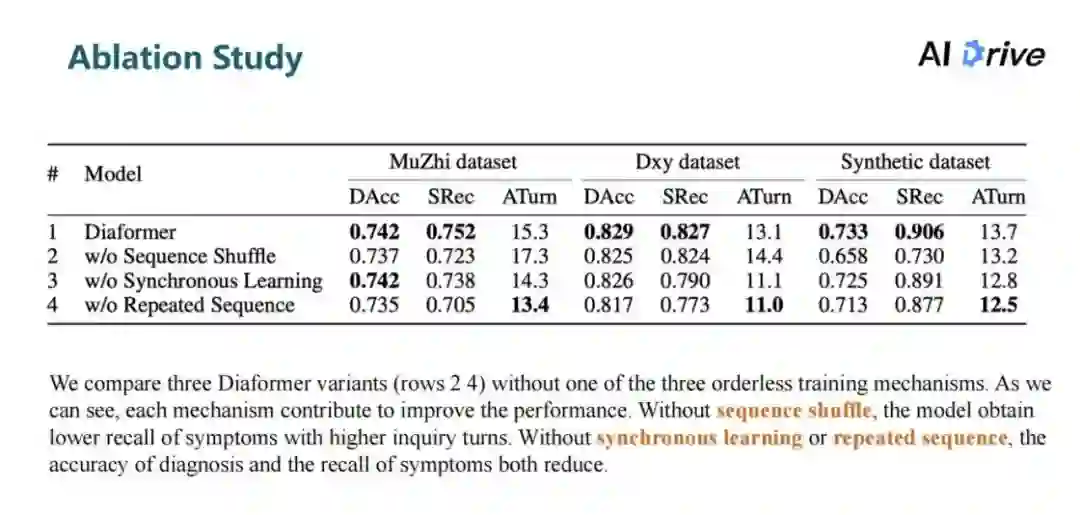 对三个的无序训练机制设定了一个消融实验,结果表明在缺少任何一种无序训练机制的情况下,症状的召回率还有疾病预测的准确率都会出现不同程度的下降,尤其是在比规模较大的合成数据集上,其性能下滑最为明显。