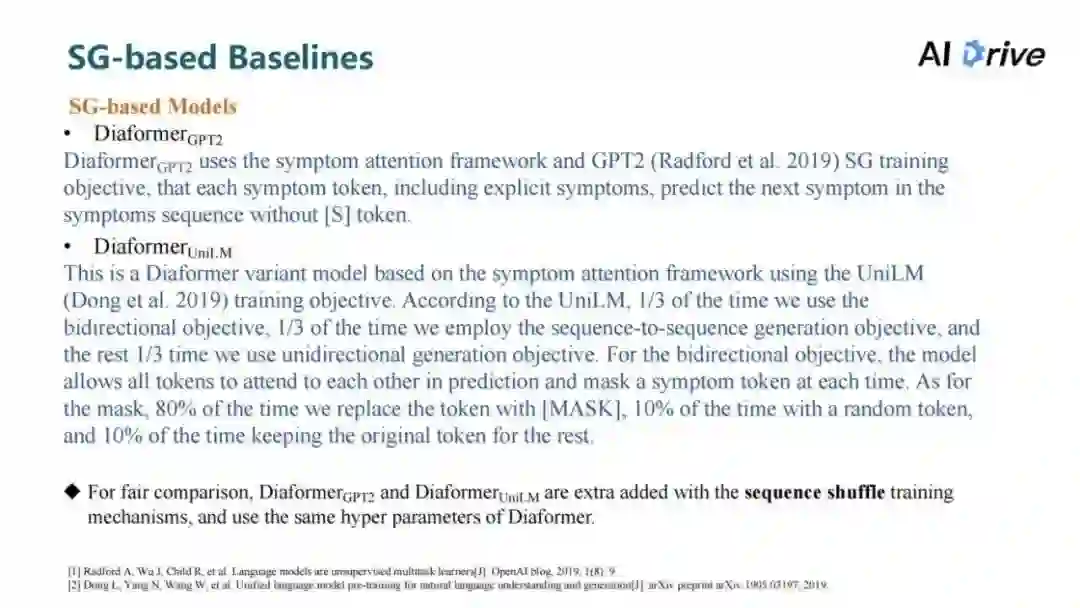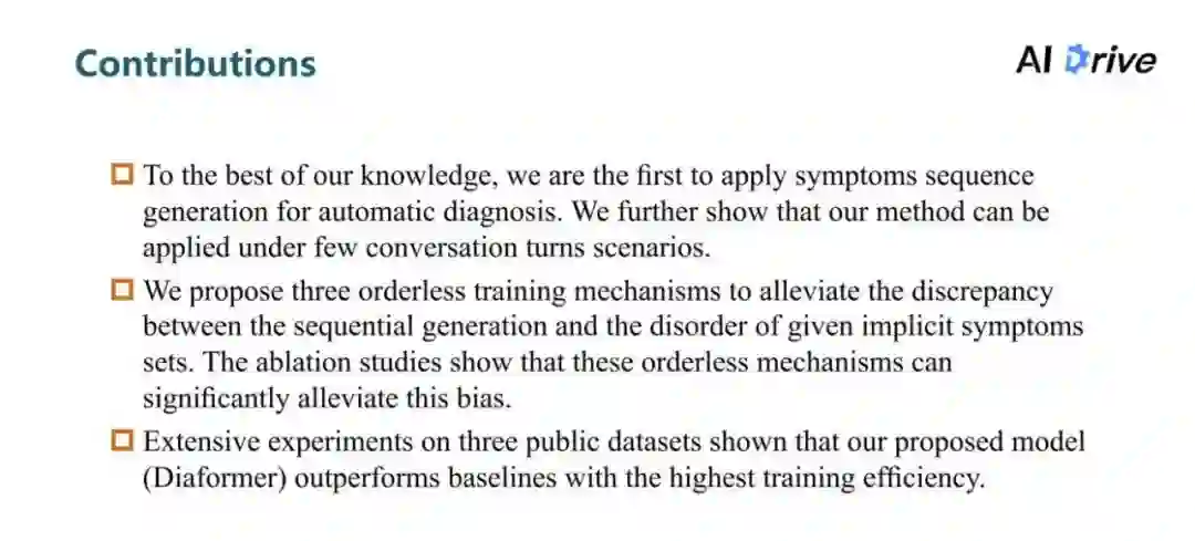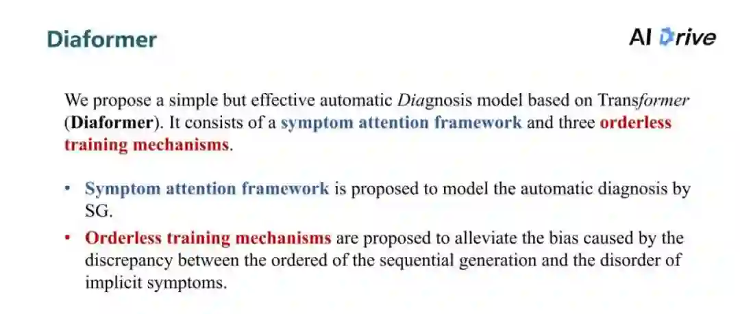 该工作将自动诊断形式化为序列生成任务,提出了一个症状注意力生成架构去直接学习症状询问选择和疾病诊断之间的潜在关联,并提出三种无序训练机制来有效减小序列生成的有序性与患者症状本身的无序性偏差;实验结果表明,Diaformer 模型在三个公开自动诊断数据集上都取得了目前最好的结果,并且有着更高的学习效率。