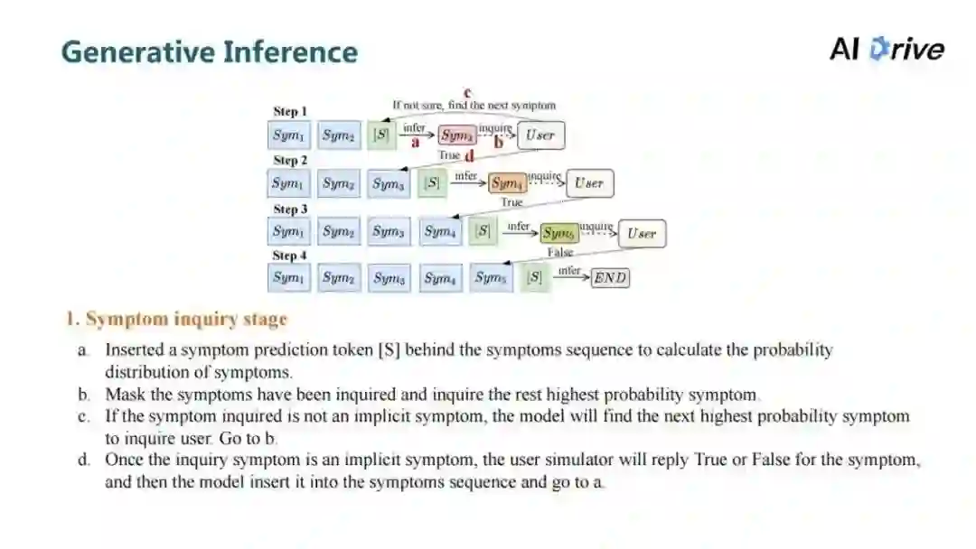 在推理时,需要一个用户的模拟器(图中“User”),它包含了所有的隐性症状信息,模型一开始获得显性症状;通过拼接症状预测符号,计算得到症状的概率分布。接着 Mask 已经询问过的症状,询问剩下症状中概率最高的症状。