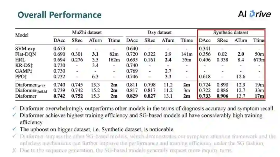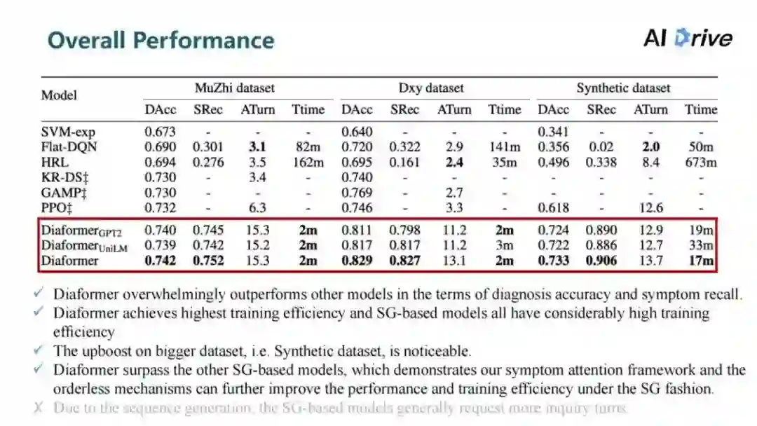 上图是本论文的一个贡献点,该论文是首次采用虚症状序列生成的模型做自动诊断的方法,因为之前大部分模型大多采用强化学习的方法,还有一些基于 SVM、基于逻辑回归、基于随机森林的方法,进一步展示了模型,可以在有限的论述中,能比其它基线模型要好。