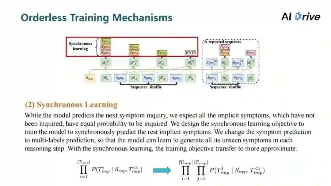 第二个机制是同步学习,对于每一阶段的症状询问预测,不应该是未被询问的症状里的某个症状,因为在未被询问的隐性症状里面,每个症状都应该是被预测的,所以在每一阶段让模型去学习预测出所有未被询问的隐形症状。由此将序列生成过程转变为多标签的序列生成过程。