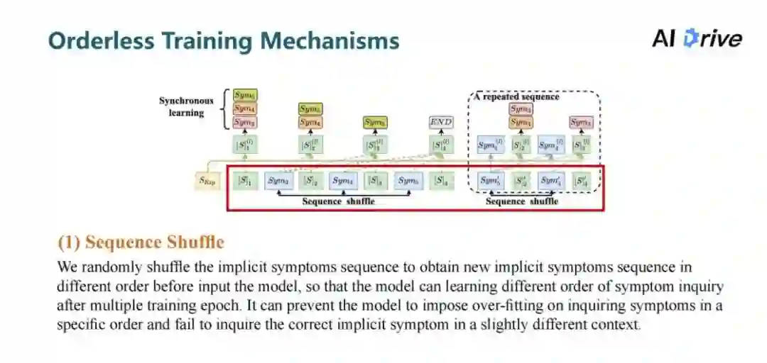 以上症状注意力框架是一个序列生成模型,它只能学习特定顺序的症状序列的生成,模型会在症状序列的次序下学习症状推理。但是在数据集或是在现实生活中,患者的隐性症状本身是没有次序关系,所以这导致了序列生成的有次序询问的学习逻辑与隐形症状推理的无序性的偏差。对此提出了三个无序的训练机制,让模型不依赖于特定的症状次序推理,从而学习显性症状到隐性症状以及隐性症状之间的推理。
