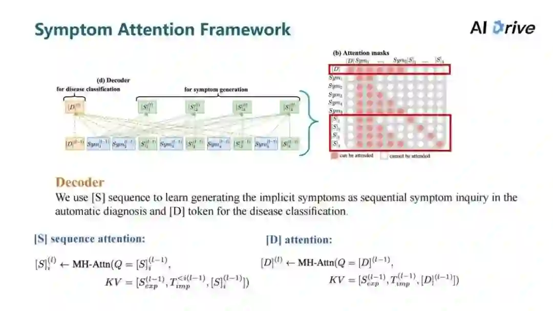 对于解码器,使用了两个人工符号,一个是症状预测的符号,另一个是疾病预测的符号。在训练过程中,利用症状预测符号序列来实现隐性症状序列的自回归生成,可视为一次学习多个阶段的症状推理;疾病预测符号则基于所有症状信息学习生成目标疾病。