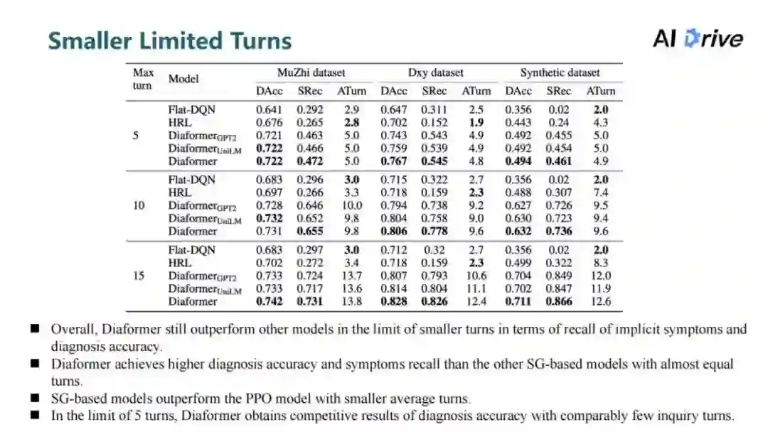 对此,设计了更小的限制轮数实验,测验序列生成模型在更低的询问次数情况下的表现。在原本 20 轮的基础上,增设了 5、10、15 的最多询问次数。在合成数据集的 10 轮询问的性质下,Diaformer 相比于强化学习最好的方法疾病诊断诊断准确率更高、所需询问轮数更少;在限制 5 轮的情况下,模型依旧能取得比较好的症状召回率和疾病预测的准确性。结果说明在更少的询问次数下,序列生成模型也能获得比较好的结果。