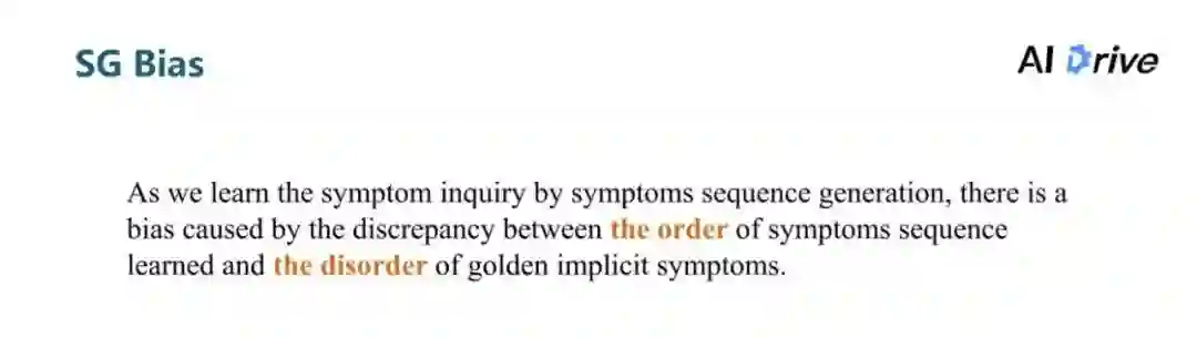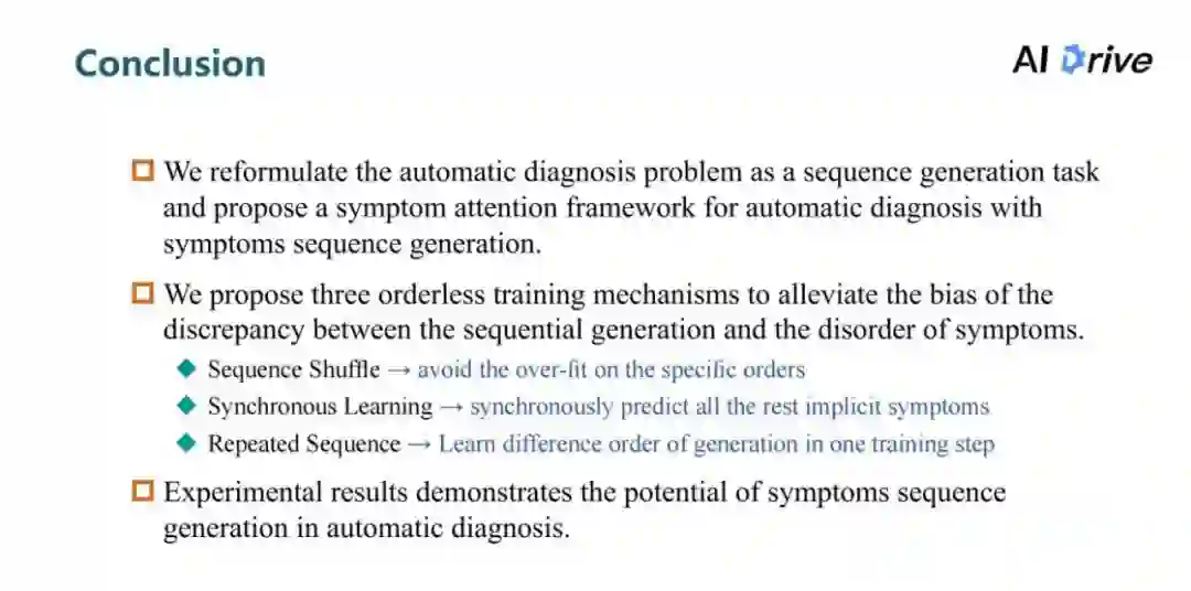 该工作将自动诊断任务形式化为序列生成任务,并提出了症状的注意力框架来实现序列生成的方式做自动诊断。此外提出了三个无序的训练机制,去减小训练生成的有序性与症状推理的无序性的偏差。这三个机制第一个是序列打乱,用来避免过度依赖于特定的测序的症状的询问;第二个是同步学习,即改成多标签的序列生成过程,预测所有的未被询问的隐性症状;第三个是重复序列,让模型在一个训练数据里学习序列不同次序的生成。结果表明,症状序列生成在自动诊断中是可行的。
