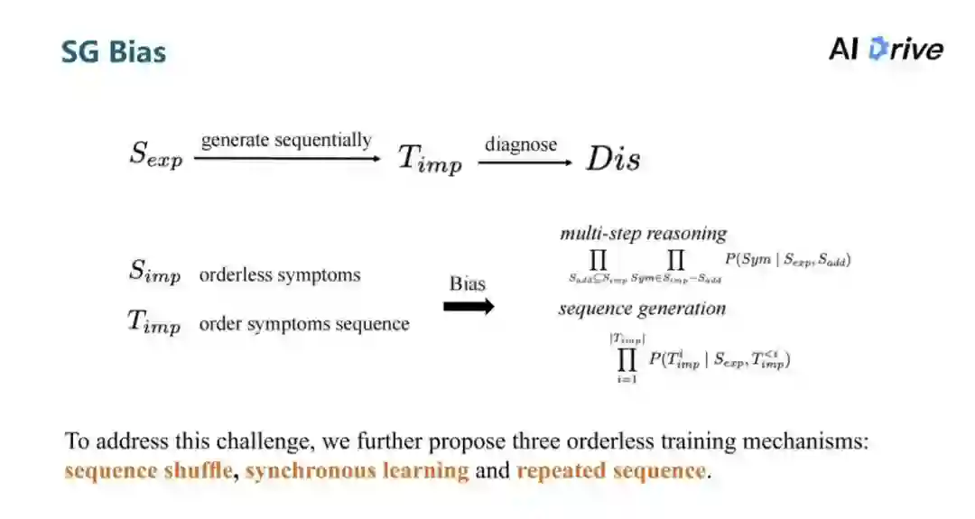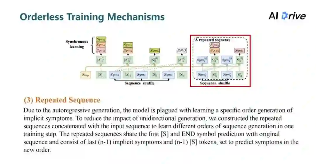 第三个机制是重复序列,因为采用自回归生成的训练方式,每一个症状只能看到其前面症状的信息,模型在一条训练数据里只能学习到单一方向的症状预测,比如症状五能看到症状四和症状三的信息,如果先去学习预测症状五,再去预测症状四的时候就会导致信息的泄露。
