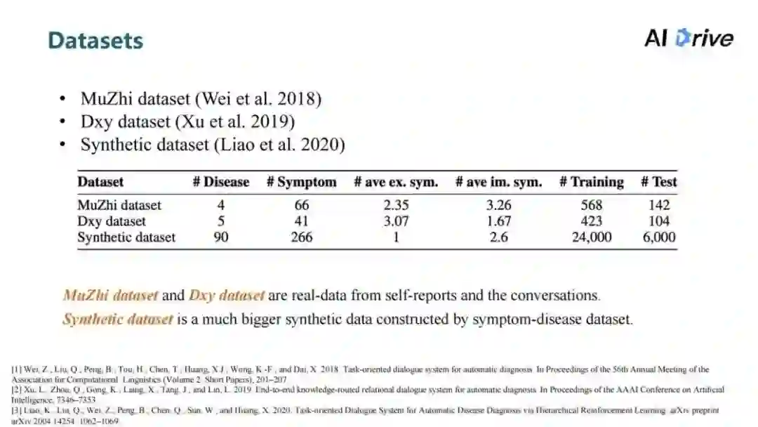 实验使用了三个公开的数据集。前两个数据集来源于真实数据,基于患者的自我报告以及患者和医生的对话流程构建。第三个数据集是基于症状到疾病的知识库构建的合成数据。合成数据集的数据规模明显大于前面两个真实数据,它的症状和疾病种类也明显更多。