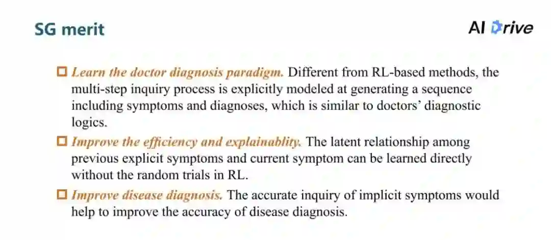 但是强化学习如何查询症状,并在最后的准确率的奖励下才会做出这种疾病诊断,这其中存在偏差,也在一定程度上偏离了医生的实际诊断流程。