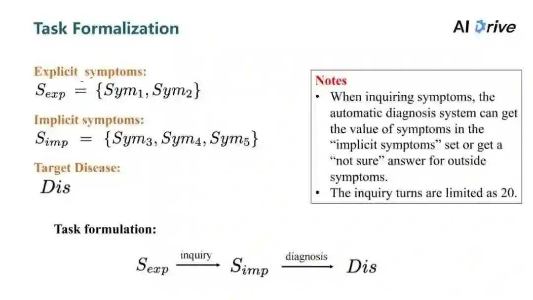 做这个系统的出发点是:由于隐性症状的存在,这个任务可以被视为一个多步骤的推理问题。它的挑战是在于如何捕捉推理过程中的基本动态和不确定性,并且在很少的标记数据和有限的轮毂中来查询准确的症状。