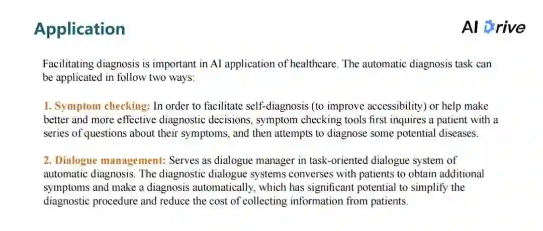 自动诊断任务也可以应用到以下两种应用中。第一种是 Symptom checking,症状检查工具基于患者给定的症状询问有关的症状,然后尝试诊断一些潜在的疾病,可以用于帮助患者的自我诊断以及用作医生的辅助诊断。