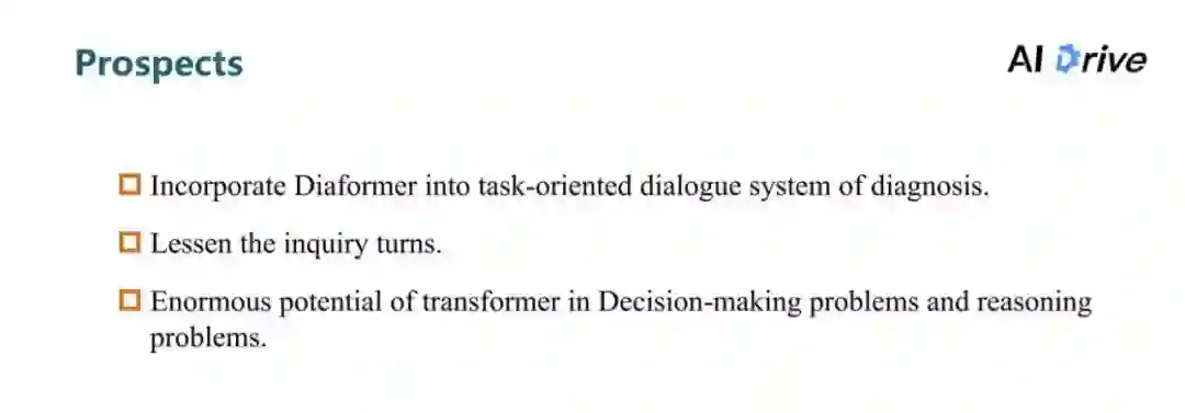 最后是对未来工作的展望。第一是将自动诊断模型 Diaformer 整合到自动诊断的对话系统中,或者是一些任务导向型的对话系统中。因为对话系统本身是比如依赖于生成模型,而采用序列生成的方式,相比于强化学习方式,能更好的融入到对话生成里。第二个是找到更好的方法去有效减少序列生成的询问次数,第三是挖掘 Transformer 在决策推理问题上的潜力。