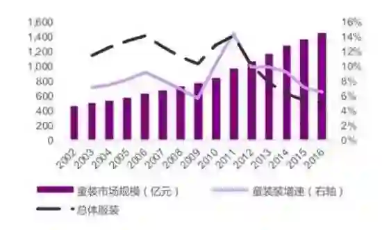 据第一财经统计数据,从2002年至2016年,15年间,童装市场规模从2012年起就达到了千亿规模。