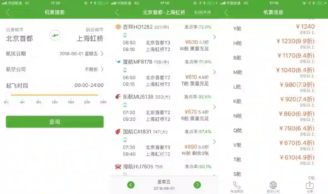 航旅纵横机票舱位查询结果