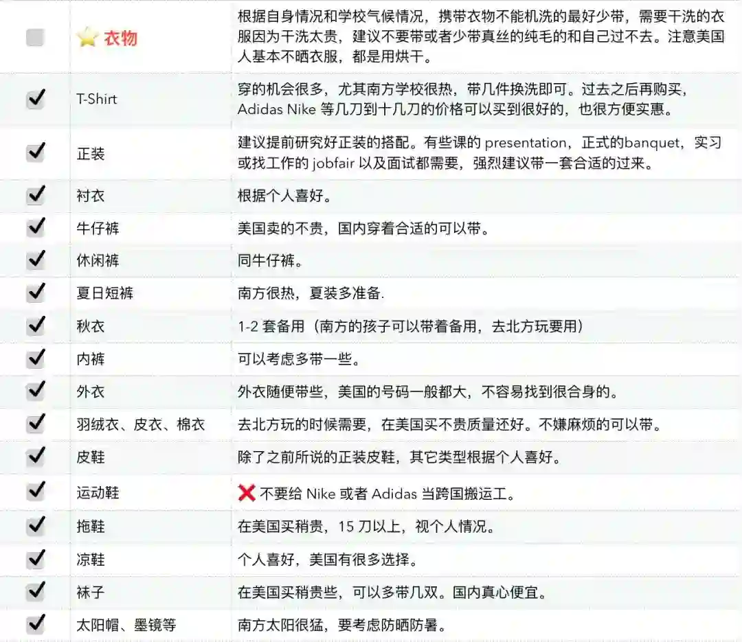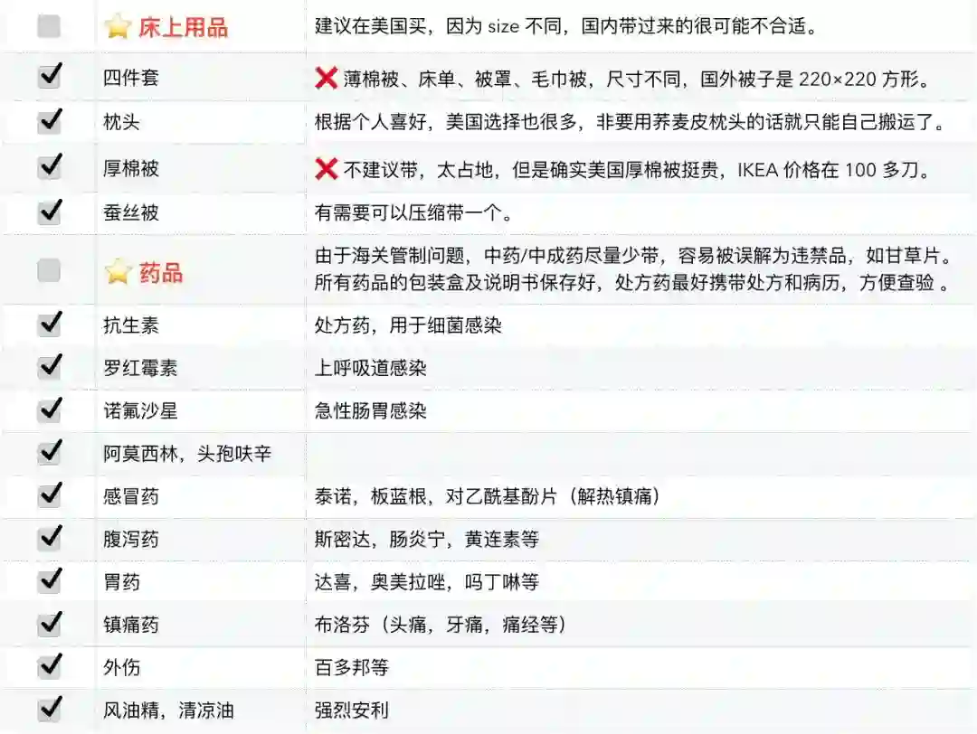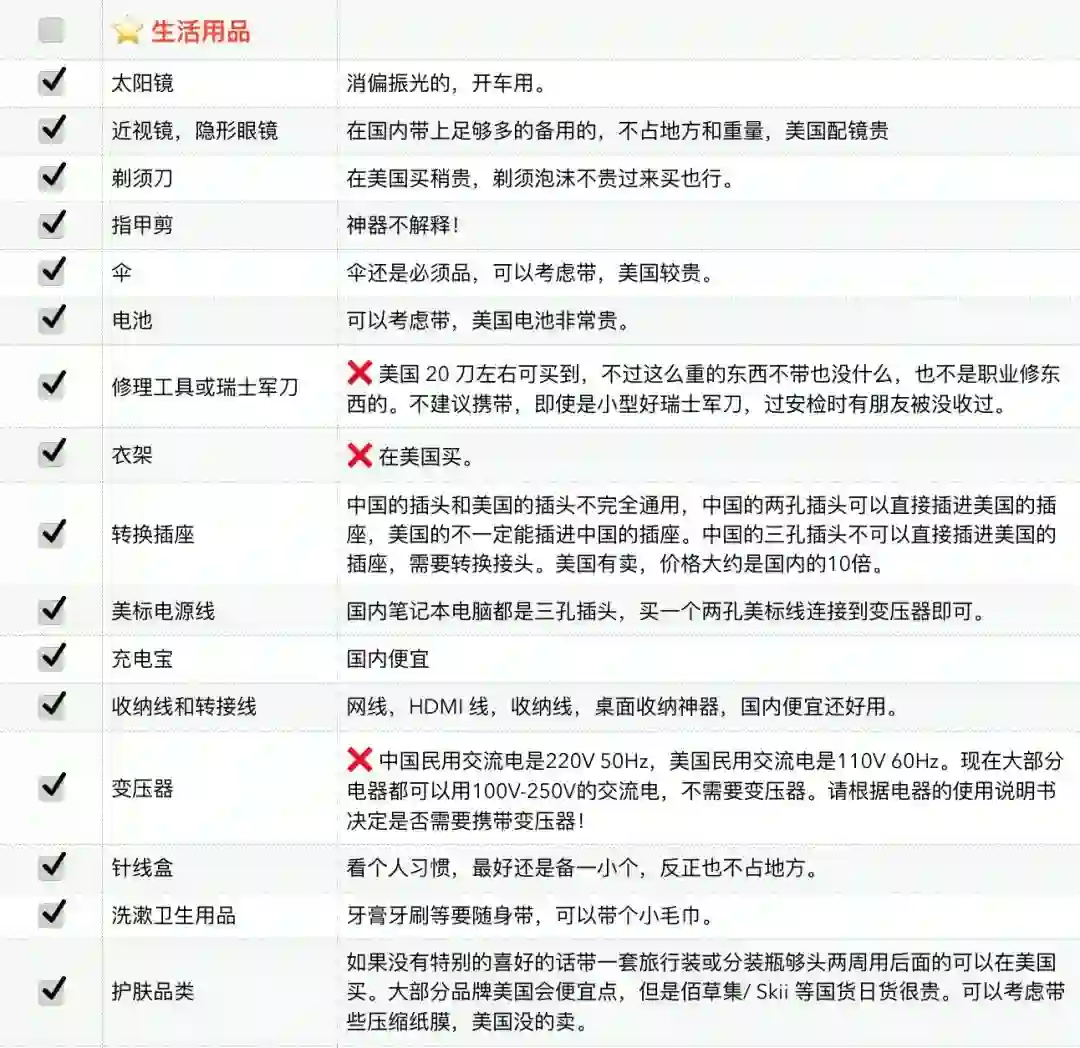 原则上说,只需要带上足够的银子,那么行前准备物品基本都可以选择不带,美国当地人也需要生活,生活必需品都能够买到。于是我们清楚了我们所要托运半个地球带的东西主要是为了省钱、方便和个人喜好。有了这个原则,就可以对以下的 list 有一个自己的判断,不要干费力不讨好的事情,行李超重了被罚了钱,之前为了节约的那一二十刀就直接交给了航空公司。习惯不同,每个人有不同的的行李准备的选择,这里只说一点:根据学校的地理,气候,学校要求来以及个人的喜好来选择相应的托运行李的内容。最后还是再强调一点,出门以前称好行李重量,不要到了机场托运时才被人告知超重,于是前功尽弃。
