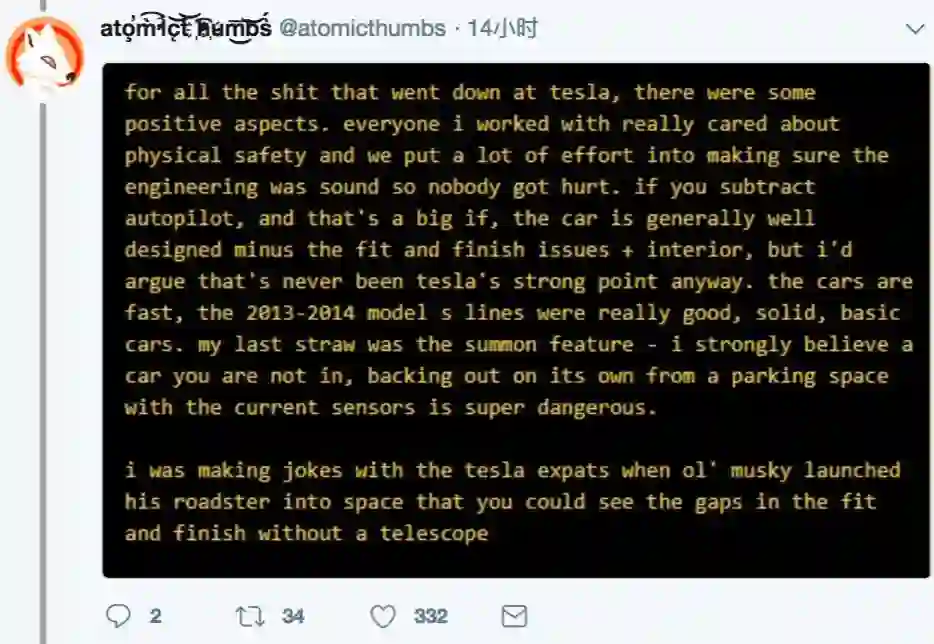 但同时,这名前员工也表示,他和所有的特斯拉员工一样,都将客户的安全放在第一位,是真的很关心用户的生命安全,也为此投入了很多心力。