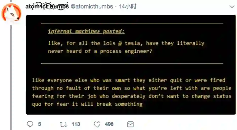 “这就是你为什么总听说特斯拉的员工都在拼命透支,他们成功把所有人都赶走了。”