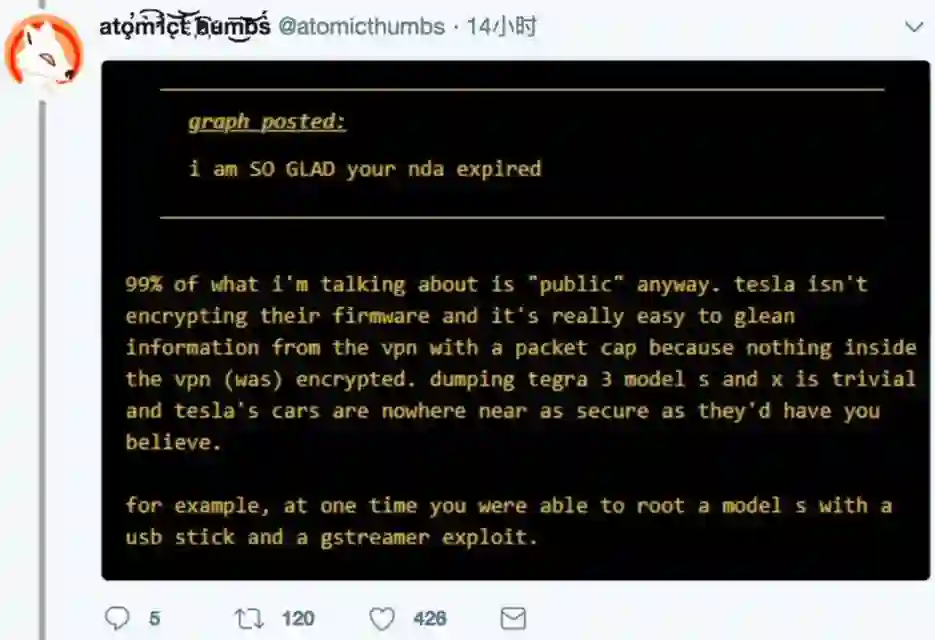 这位前员工称,他所说的99%都是“公开”信息。特斯拉并没有加密固件,通过VPN很容易就能或许相关信息。
