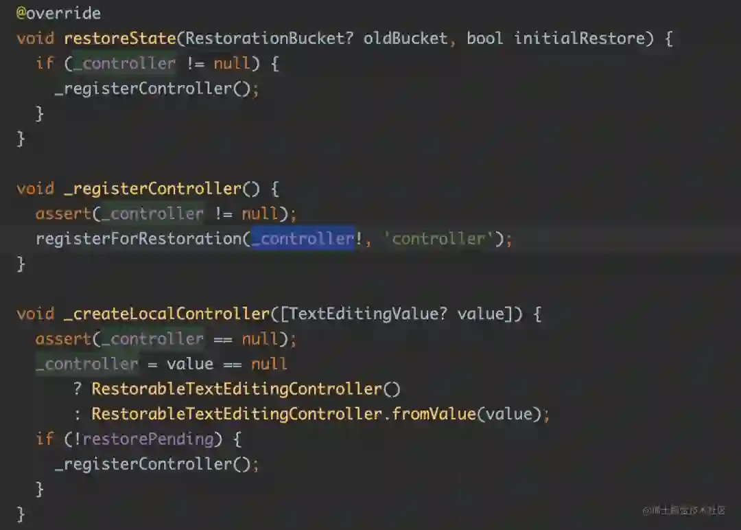 因为输入框的内容默认保存在了 TextEditingController 的 TextEditingValue 里,所以这里用的是 RestorableTextEditingController。