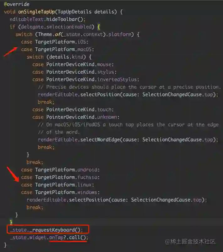 例如在 _TextFieldSelectionGestureDetectorBuilder 中,可以看到 onSingleTapUp 的处理流程: