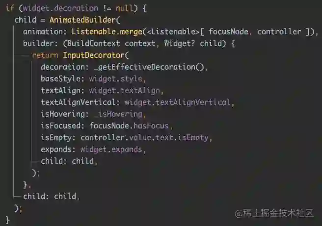 关于 InputDecorator 的内部参数解析这里就不多说,以前在书里已经有详细介绍过,用过 TextField 的大家对于 InputDecorator 应该也不会陌生,在 TextField 里 InputDecorator 的实现是和 AnimatedBuilder 一起组成使用。