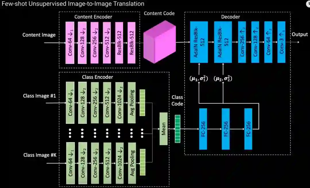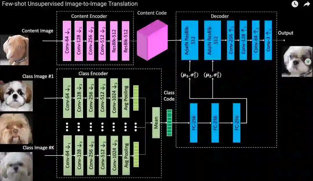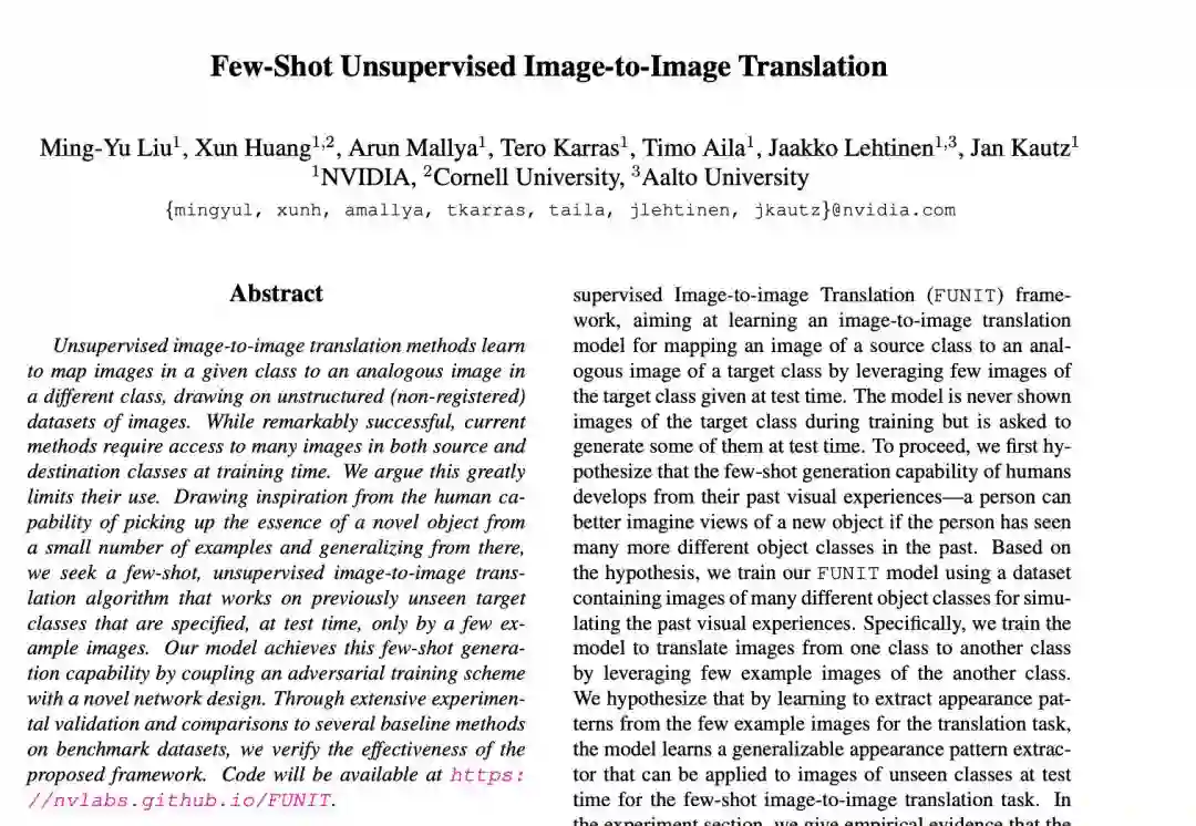 人类通常具有可以从少数例子中找到新物体本质的能力,研究人员以此为灵感并加以推广,他们寻求一种小样本的、无监督的图像到图像的转换算法,该算法适用于以前从未见过的目标类别。 在测试时仅指定几个示例图片,该模型通过将对抗训练方案与新颖的网络设计相结合,实现了这种小样本的泛化能力。 通过广泛的实验验证和与基准数据集的几种基线方法的比较,验证了所提出框架的有效性。