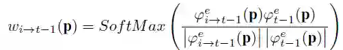 其中softmax相当于把权重归一化一下。这里i取t-1到t-6。此处操作,相当于所有特征和t-1帧特征计算一次cos距离,与t-1帧越相似,则权重越大。显而易见,第t-1帧和第t-1帧肯定是最相似的,因为他们完全一样。