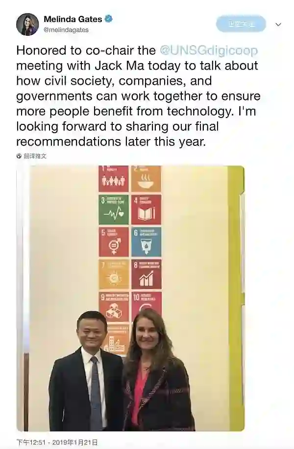 梅琳达·盖茨在社交媒体上发布和马云的合影