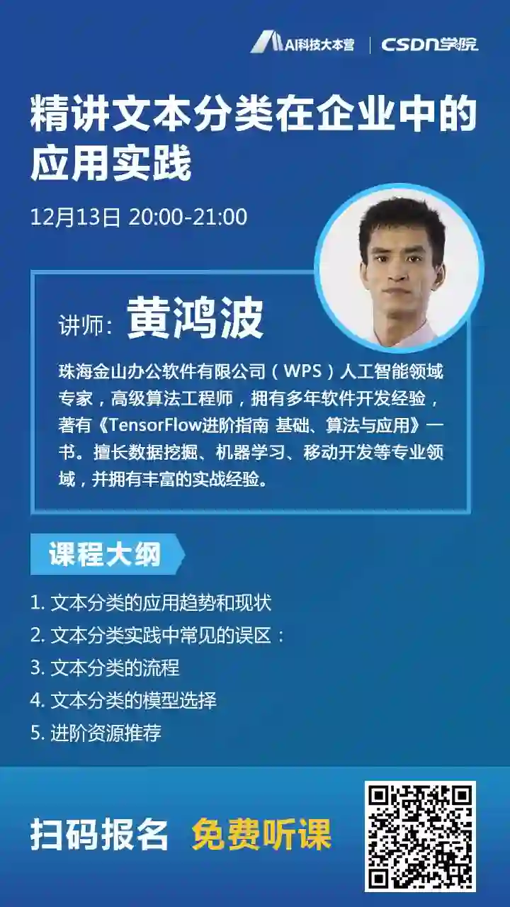 黄鸿波,珠海金山办公软件有限公司(WPS)人工智能领域专家,高级算法工程师,拥有多年软件开发经验,著有《TensorFlow进阶指南 基础、算法与应用》一书。擅长数据挖掘、机器学习、移动开发等专业领域,并拥有丰富的实战经验。