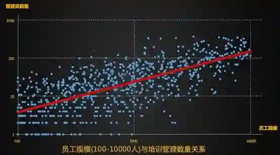 横坐标是学员的规模,纵坐标是管理员数量,我们看到企业规模与培训管理员也存在近似的规律。参考《规模》一书中所谈到的假设: