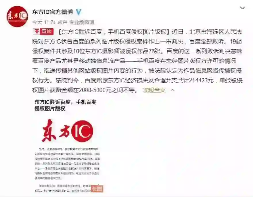 近日,北京市海淀区人民法院对东方IC状告百度的系列图片版权侵权案件作出一审判决,百度全部败诉。法院判令,百度赔偿东方IC经济损失及合理开支共计214423元,单张被侵权图片获赔金额在2000-5000元之间不等。
