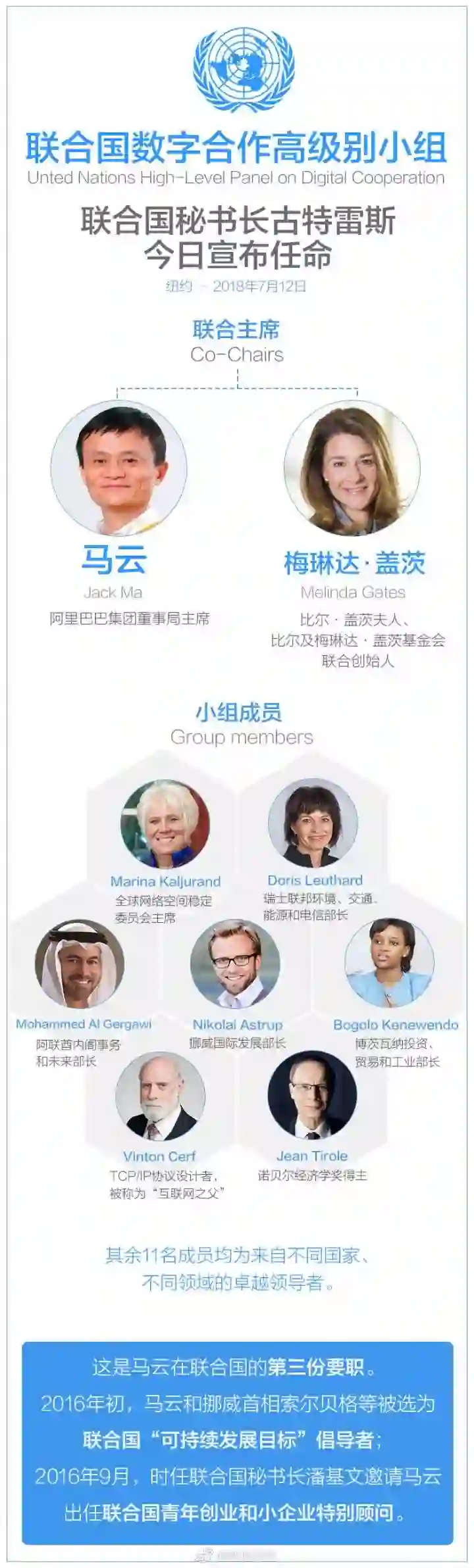 7月12日,联合国秘书长古特雷斯宣布推出数字合作高级别小组,任命马云、比尔及梅琳达·盖茨基金会联合创始人梅琳达·盖茨为联合主席。该小组旨在通过跨领域和跨国界的合作,挖掘数字技术的社会和经济潜能,确保所有人都能受益于一个安全普惠的数字化未来。