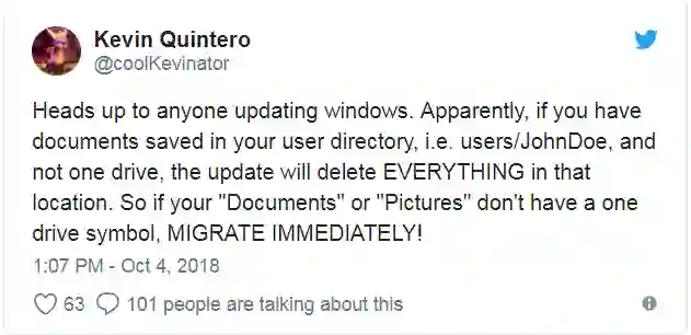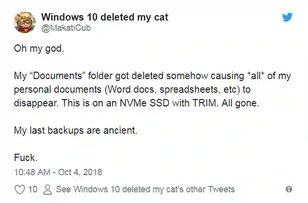 用户反映的最严重问题显然是,他们在安装Windows 10 October 2018 Update后,发现丢失了大量文件。 Twitter论坛和微软论坛上的众多用户都在反映这个问题。