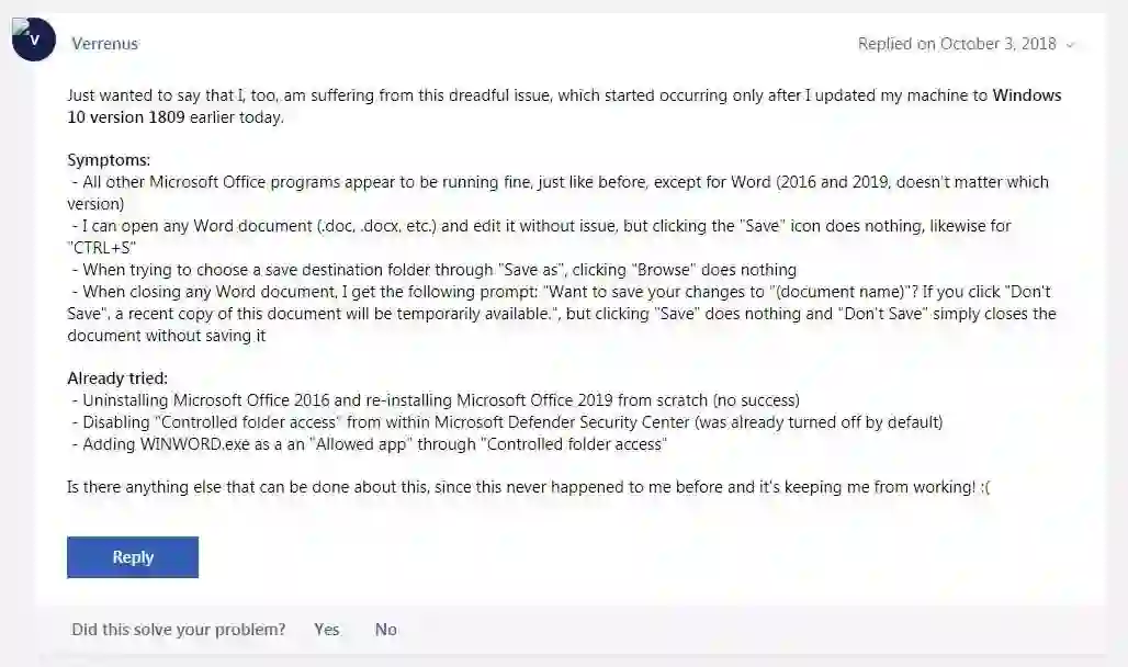 其他用户反映安装该更新版后无法保存Word文档。他们可以正常打开文档,但是试图使用“保存”或“另存为”按钮来保存文档时,没有任何反应。