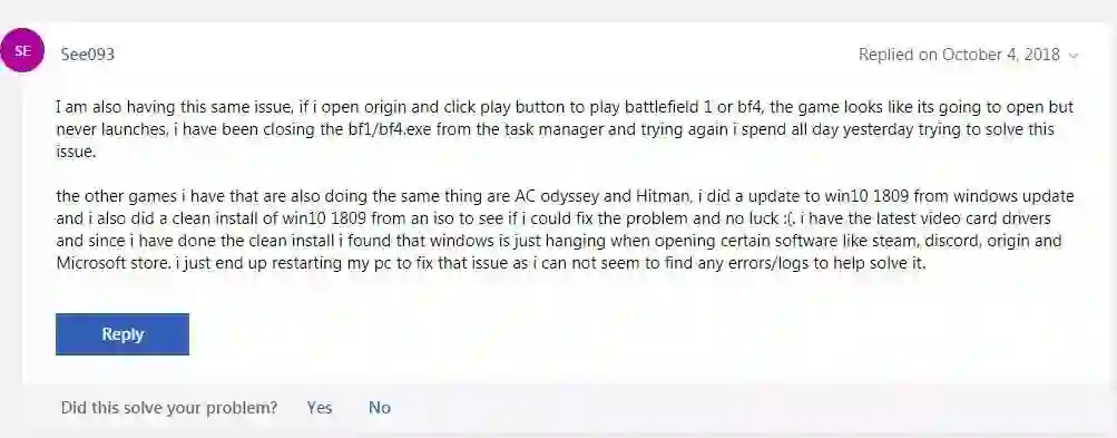 其他用户在微软论坛上反映,他们在安装October 2018更新版后再也无法运行各种游戏。比如说,两个用户反映,更新之前一切正常的游戏现在不是崩溃就是永远打不开。