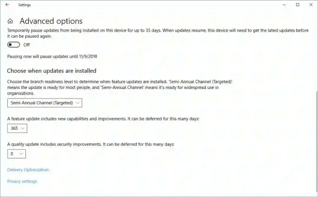 “高级选项”屏幕打开后,你应该更改“特性更新包括新功能和改进。可以推迟更新多少天:”这个设置,将其设置为60天。这应该让微软有足够的时间来解决问题。
