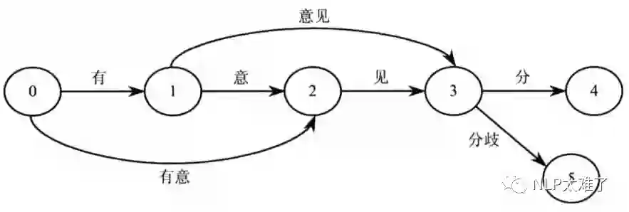 那么具体是怎么做的呢?分为两步:1. 根据dict.txt词典生成trie树;2. 对待分词句子,根据trie树,生成DAG。实际上,通俗的说,就是对待分词句子,根据给定的词典进行查词典操作,生成几种可能的句子切分,形成类似上图所示的DAG图。