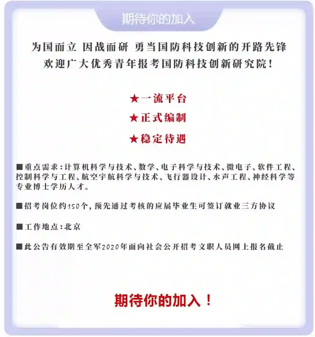 博研学历:先期可投递简历至:jskxyjob5@163.com,进行初步筛选联系(专业对口、考核优秀的可签订就业三方协议)。待全军文职人员招考岗位计划公布,通过军队人才网,即中国人民解放军专业技术人才网:HTTP://WWW.81RC.MIL.CNHTTP://81RC.81.CN,登陆2020年全军面向社会公开招考文职人员报名入口,提交报名信息及选择意向岗位,审核通过后直接参加专家组面试考核(不参加全军统一考试),经政审、体检后入职。