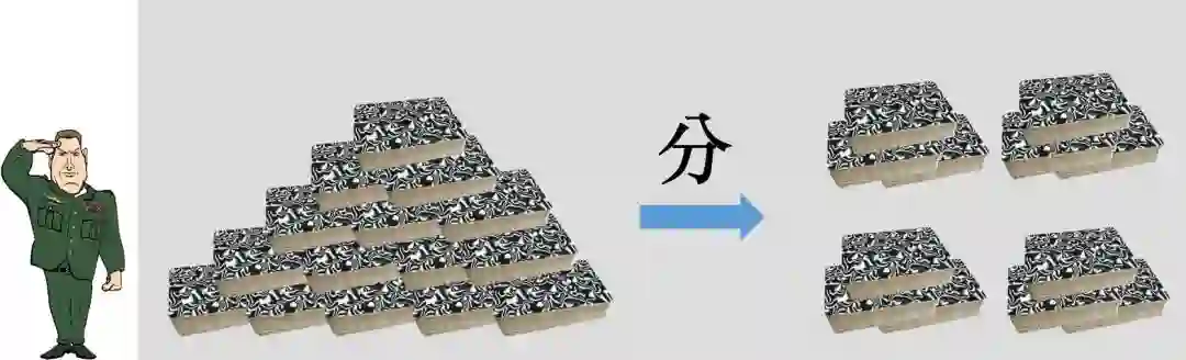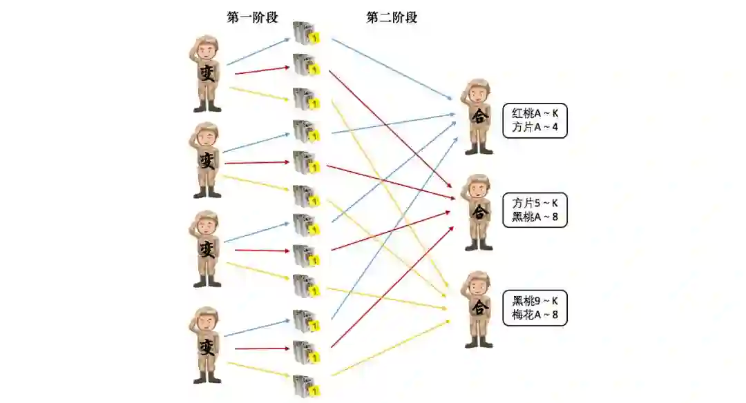 “指挥官”在切分扑克牌之前,会先分配好“变计算兵”和“合计算兵”的数量,然后根据“变计算兵”的数量把扑克拆分成相应的份数,将每份扑克分给一个“变计算兵”,然后进入下一步。