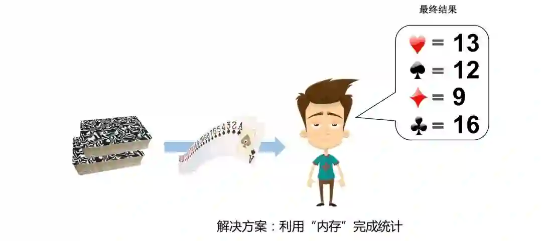 你的答案可能脱口而出:对于“人型计算机”而言,直接在大脑中记住每个花色的个数,一张一张地取扑克牌计数,处理完所有的扑克牌之后报4个花色的个数就行。答案完全正确,正常计算机最简单的计算模式就是这样的,内存中记录统计结果,随着输入设备不断读取数据,更新内存中的统计结果,最后从输出设备展示结果: