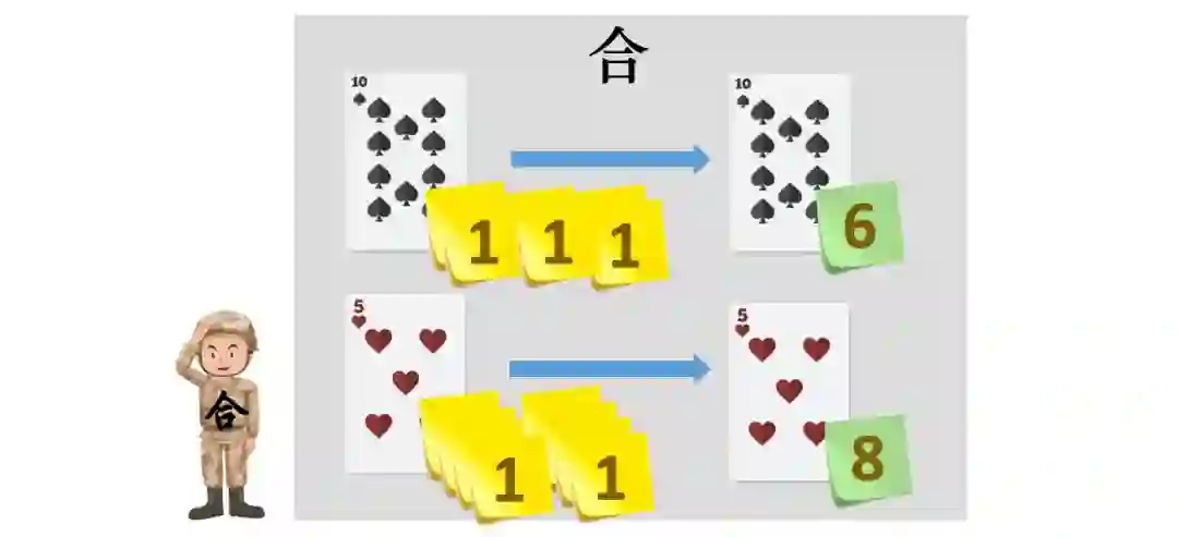 “合计算兵”将手中的变种扑克牌按照相同的计算规则依次进行合并,计算规则也需要根据具体问题来制定,在这里是对扑克牌上标签的数值直接累加,统计出最终的结果。