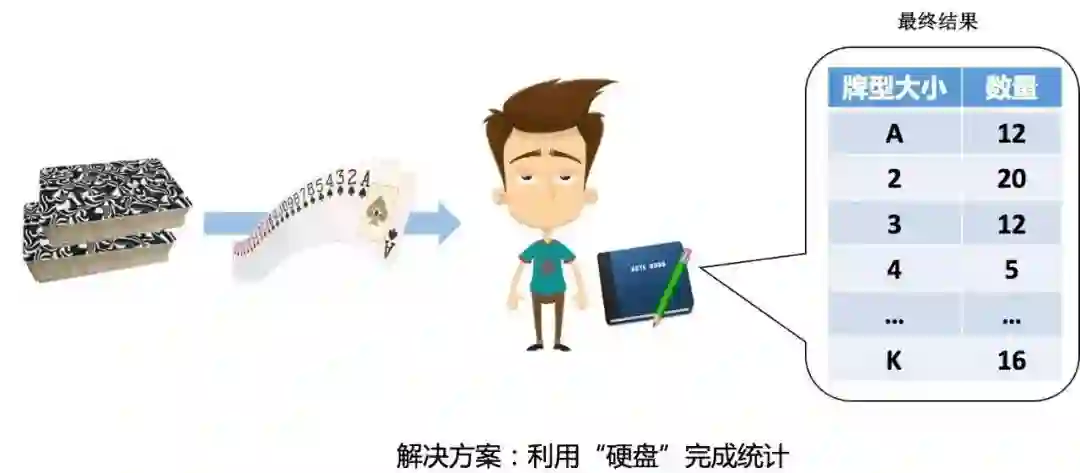 怎么样,有没有感觉到大数据扑面而来?要知道我们“人型计算机”的“内存“和“硬盘”是有容量限制的,52种牌型的信息已经超出了单台计算机的处理能力。当然这里会有人提出质疑,认为扩充内存或者磁盘容量就可以解决这个问题,52种牌型完全不需要分布式计算。那大家考虑一下假如这堆牌中有几百种、甚至几千种牌型呢?
