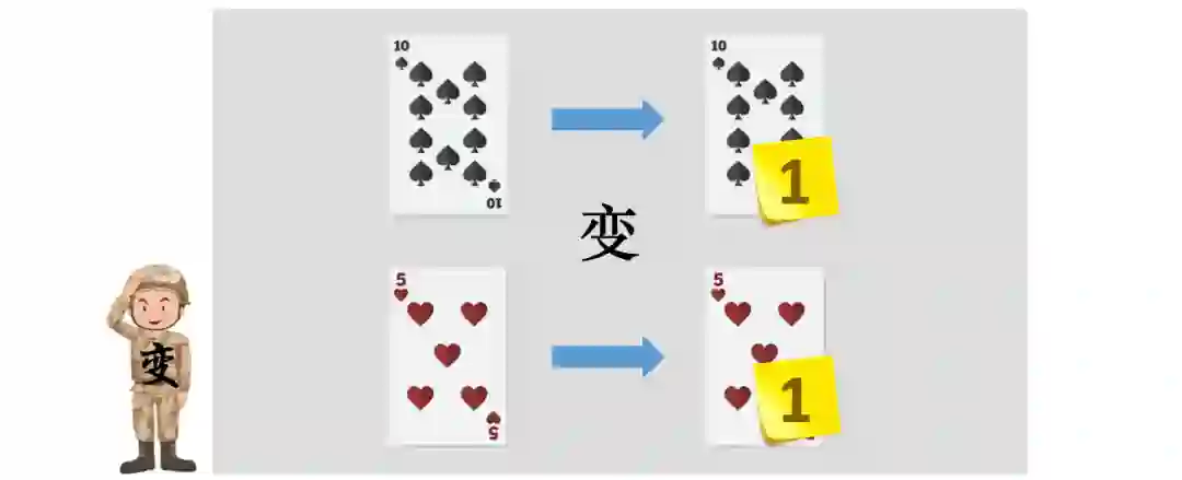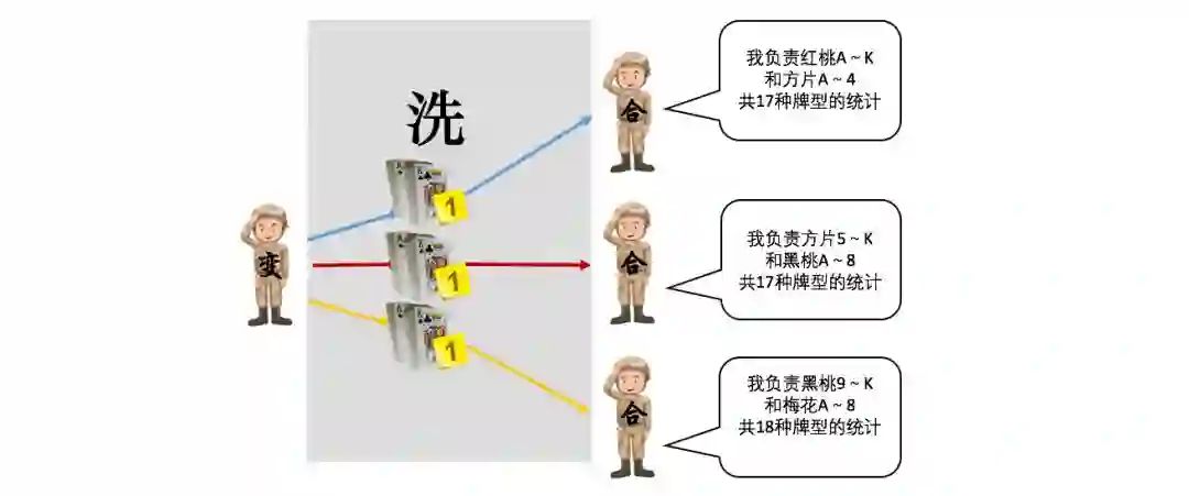 我们把这种贴了标签的扑克牌叫做变种扑克牌。当在后续的步骤中统计牌型个数时,只需要把每个标签上的数字加起来就可以。有的朋友肯定会好奇为什么不让每个“计算兵”直接统计各自的所有牌型的扑克的个数,这是因为这种“映射变换”运算的本质在于将每张扑克牌都进行同一种相同规则的变换,统计个数的工作要留在最后一步完成。严格的流水化操作,会让整体的效率更高,而且变换的规则要根据具体问题来制定,更容易适配不同种类的计算。