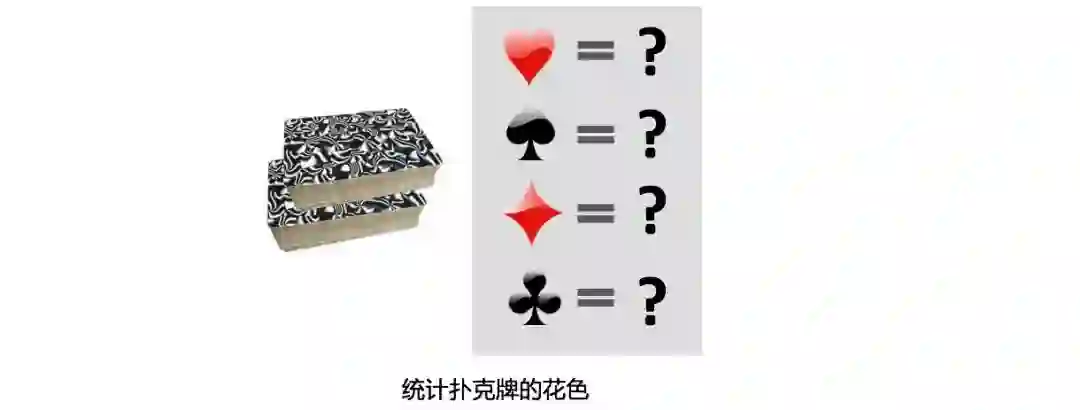 看起来这台“人型计算机”的性能比较差,不过好在我们需要处理的问题也不复杂:有几十张不包含大王和小王的扑克牌,这些牌的花色和大小均不确定(并不一定能凑成一副牌),如何给一台“人型计算机”设计一个程序,统计各个花色的扑克牌数量?